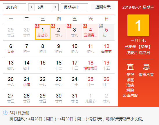 勞動(dòng)節(jié)即將來(lái)臨,根據(jù)《國(guó)務(wù)院辦公廳關(guān)于調(diào)整2019年勞動(dòng)節(jié)假期安排的通知》,2019年勞動(dòng)節(jié)放假安排調(diào)整為2019年5月1日至4日,共4天。4月28日(星期日)、5月5日(星期日)上班。