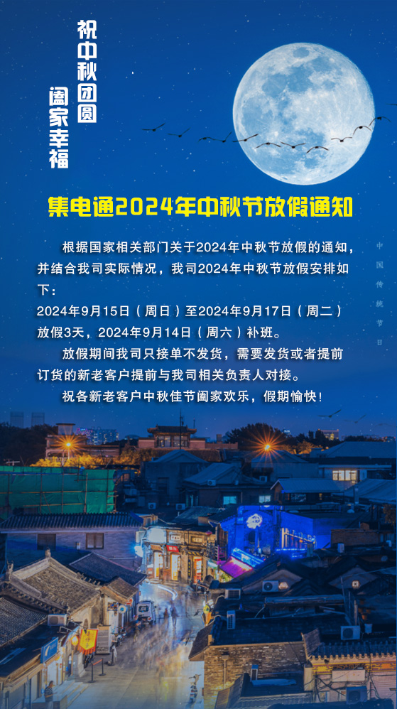 根據(jù)國家相關(guān)部門關(guān)于2024年中秋節(jié)放假的通知,并結(jié)合我司實(shí)際情況,我司2024年中秋節(jié)放假安排如下:2024年9月15日(周日)至2024年9月17日(周二)放假3天,2024年9月14日(周六)補(bǔ)班。
